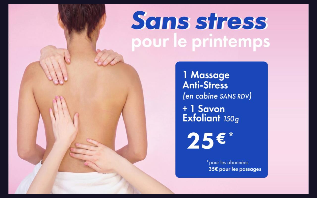 1 Massage Anti-stress (en cabine sans RDV) + 1 Savon Exfoliant 150g à 25€*