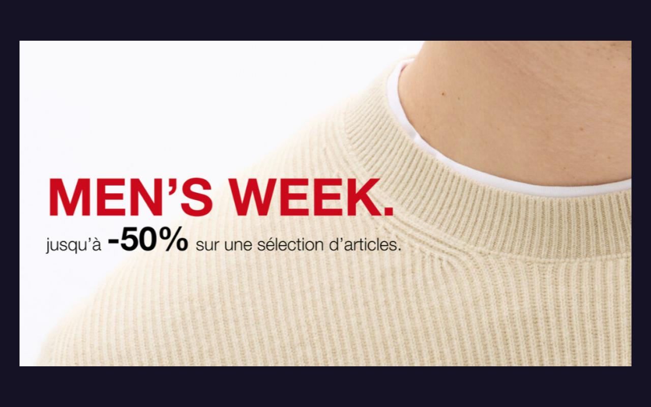 *Men’s Week du 25/03/2026 au 05/04/2026 inclus, jusqu’à -50% sur une sélection de produits masculins de marque CELIO ou licence signalés.