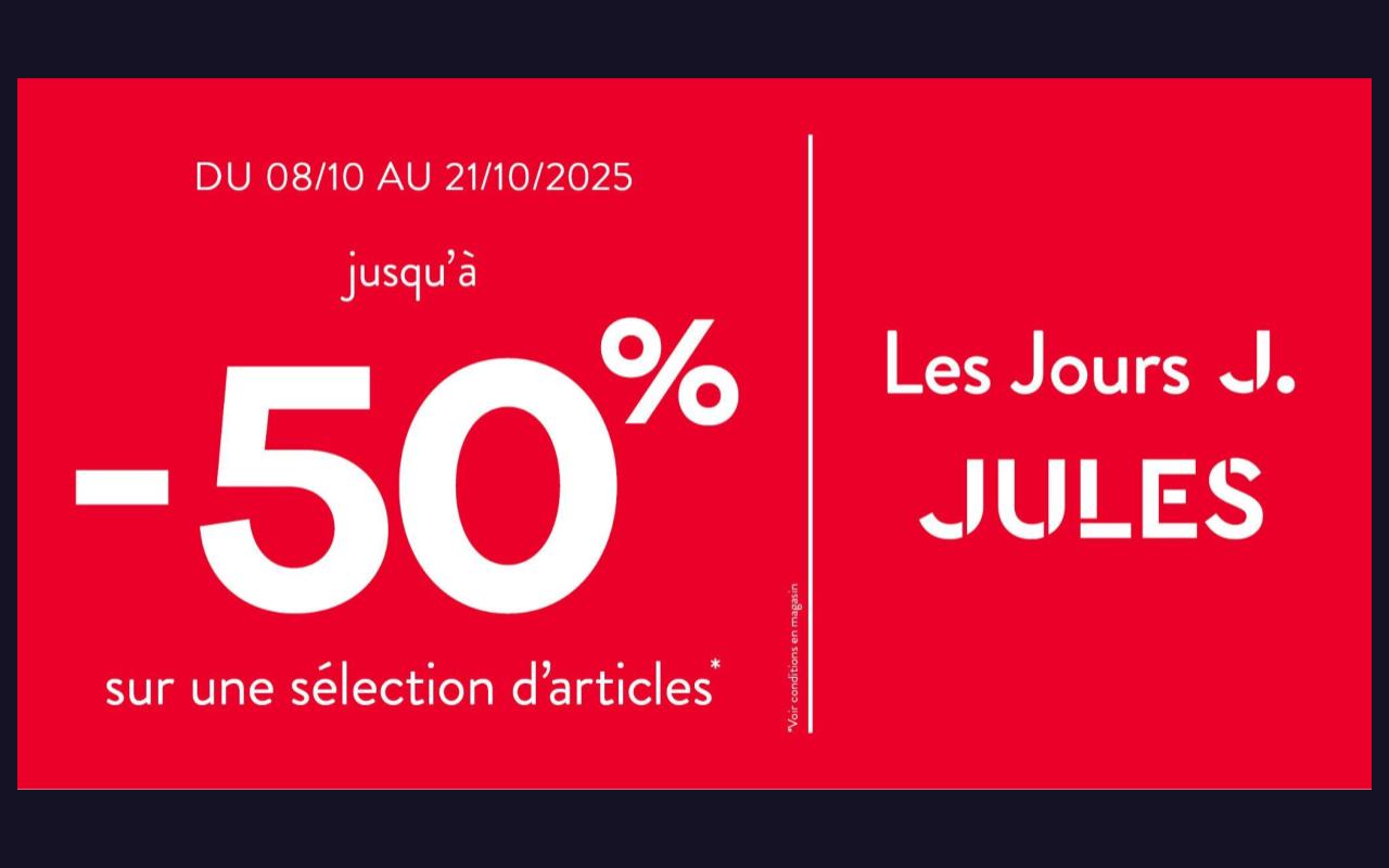 Offre non cumulable avec toutes autres promotions en cours (sauf les chèques fidélité du programme de fidélité JULES le Club).