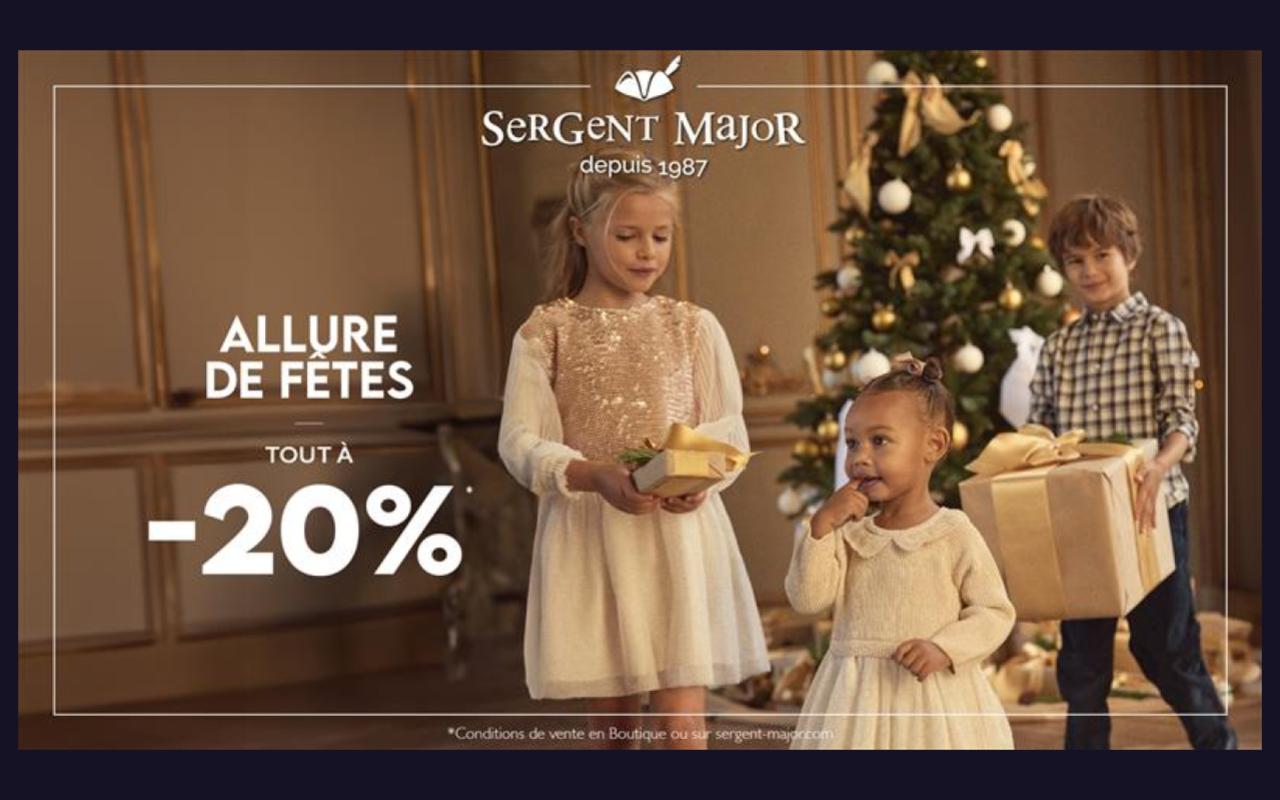 *Offre réservée aux clients « Ma Carte Major » et valable du 10/12/25 au 24/12/25 dans toutes les Boutiques Sergent Major en France, Belgique et Luxembourg (hors Boutiques d’Usine) et sur sergent-major.com. Valable sur une sélection d’articles de Noël et autres articles étiquetés en boutique et avec une pastille sur le site Internet. Offre non cumulable avec toute autre opération en cours. Remise effectuée en caisse en boutique ou au panier sur sergent-major.com. Dans la limite des stocks disponibles.
